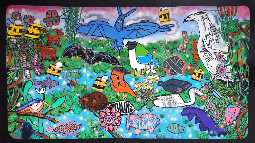 At the end of November 2023, the mural created for Friends of Cherry Hinton Brook by Rowan was unveiled by the Mayor, Councillor Jenny Gawthrope Wood at Sainsbury's.